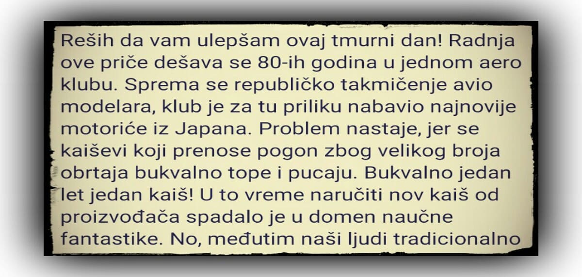 Reših da vam ulepšam ovaj tmurni dan! Radnja ove priče dešava se 80-ih godina u jednom aero klubu. Sprema se republičko takmičenje avio modelara, klub je za tu priliku nabavio najnovije motoriće iz Japana. Problem nastaje, jer se kaiševi koji prenose pogon zbog velikog broja obrtaja bukvalno tope i pucaju. Bukvalno jedan let jedan kaiš! U to vreme naručiti nov kaiš od proizvođača spadalo je u domen naučne fantastike. No, međutim naši ljudi tradicionalno iznalaze rešenje tako što jedan od članova ekipe provali da kada KONDOM sa odsečenim vrhom staviš na remenicu on jako dobro menja original kaiš i eto rešenja svih muka! Ali!!! Zbog treninga i takmičenja treba im bar 100 KOMADA!!! Kako je kupiti kondom u Srbiji i danas tabu, a u to vreme kada ih je bilo samo u centralnoj apoteci zamislite koji je problem bio da u tom momentu neko udje u apoteku i traži 100 kondoma. Dakle, nema šanse, nema kandidata, niko neće! U tom momentu ekipa snimi osmogodišnjeg klinca koji se učlanio nedavno i u tom periodu im je služio uglavnom da ide u nabavku cigareta, piva, kafe i prateće opreme.