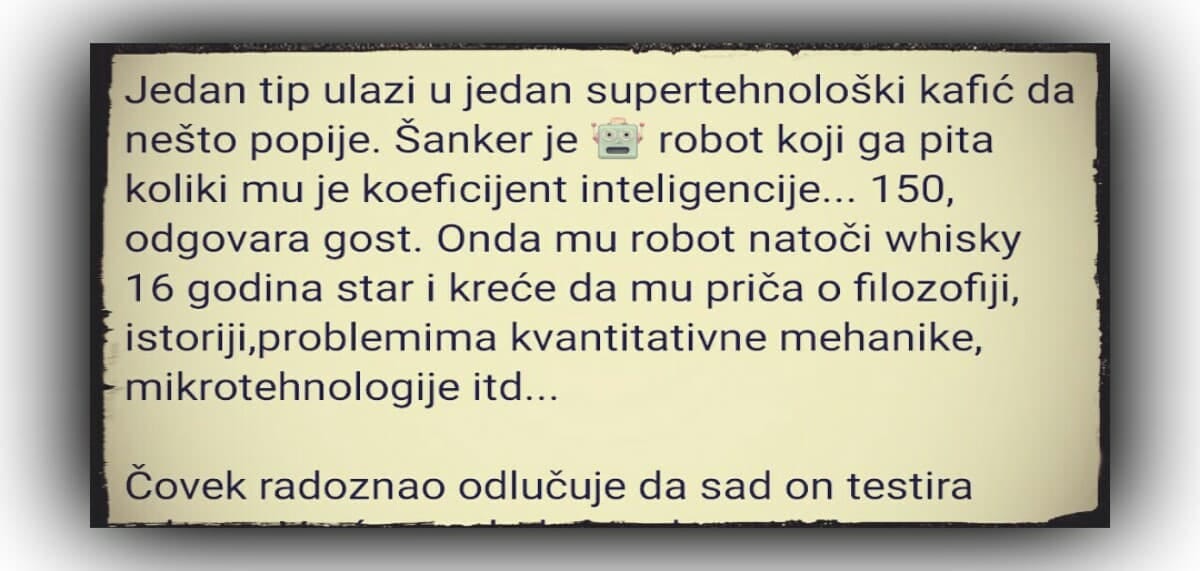 Jedan tip ulazi u jedan supertehnološki kafić da nešto popije. Šanker je 🤖 robot koji ga pita koliki mu je koeficijent inteligencije… 150, odgovara gost. Onda mu robot natoči whisky 16 godina star i kreće da mu priča o filozofiji, istoriji,problemima kvantitativne mehanike, mikrotehnologije itd…