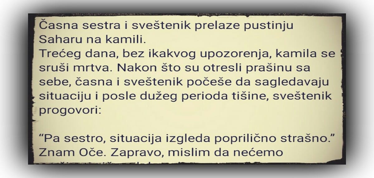 Trećeg dana, bez ikakvog upozorenja, kamila se sruši mrtva. Nakon što su otresli prašinu sa sebe, časna i sveštenik počeše da sagledavaju situaciju i posle dužeg perioda tišine, sveštenik progovori: