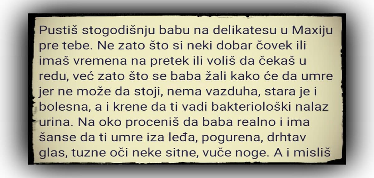 Pustiš stogodišnju babu na delikatesu u Maxiju pre tebe. Ne zato što si neki dobar čovek ili imaš vremena na pretek ili voliš da čekaš u redu, već zato što se baba žali kako će da umre jer ne može da stoji, nema vazduha, stara je i bolesna, a i krene da ti vadi bakteriološki nalaz urina. Na oko proceniš da baba realno i ima šanse da ti umre iza leđa, pogurena, drhtav glas, tuzne oči neke sitne, vuče noge. A i misliš se, ona i ne može da ponese više od 120g parizera, brzo će. A i shvatiš da ako umre tu, svi će da se sjate oko babe, izguraćete iz reda, mesarka će da se zabezekne i neće biti u stanju da te usluži, a ti ćeš da se osećaš kao govno jer nisi pusio babu.