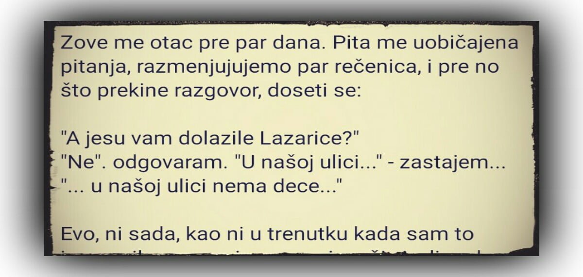 Evo, ni sada, kao ni u trenutku kada sam to izgovorila, ne verujem u svoje reči. A ulica duga, poput reke sa svojim pritokama, račva se na uličice i sokake. Pokušavam da se prisetim ljudi koje bi trebalo da znam, njihove dece, uzrasta. Nažalost i na sramotu, ne poznajem ih…