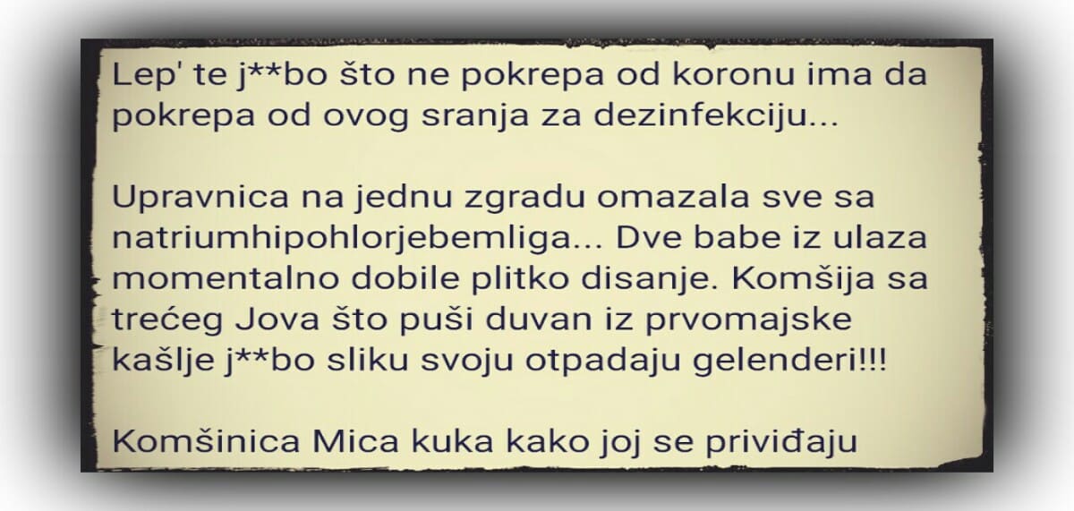 Upravnica na jednu zgradu omazala sve sa natriumhipohlorjebemliga… Dve babe iz ulaza momentalno dobile plitko disanje. Komšija sa trećeg Jova što puši duvan iz prvomajske kašlje j**bo sliku svoju otpadaju gelenderi!!!