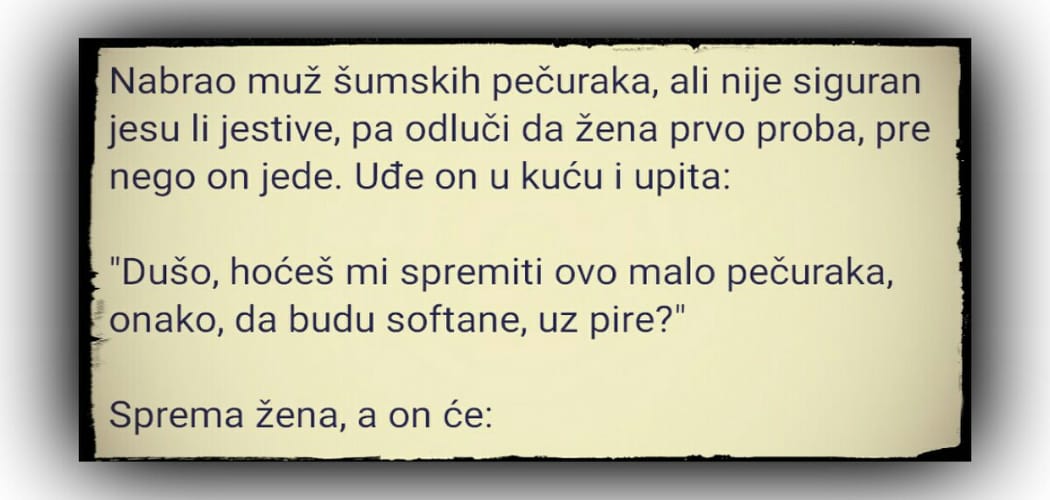 Nabrao muž šumskih pečuraka, ali nije siguran jesu li jestive, pa odluči da žena prvo proba, pre nego on jede. Uđe on u kuću i upita: