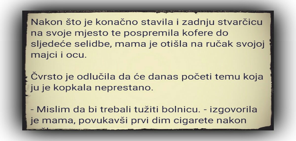 – Svejedno, trebali bi tužiti bolnicu! Koliko god korumpirani bili – uvijek postoji netko iznad njih! Postoji svjetska zdravstvena organizacija, postoji neka europska komisija garant, znači nema pola posto šanse da im se ne može stati na kraj! Tko im je dao dozvole za rad? Tko ih je zaposlio? Tko ih plaća??? U redu – po sudovima se nema smisla vući možda, ali svaka osoba koja je odradila ijednu smjenu na tom odjelu u toj bolnici bi trebala dobit otkaz! I da im se oduzme dozvola da prakticiraju medicinu u bilo kojem pogledu! Postoji i zakletva koju polažu, znaš!- mama je bila van sebe, zapanjena odgovorom svoje majke