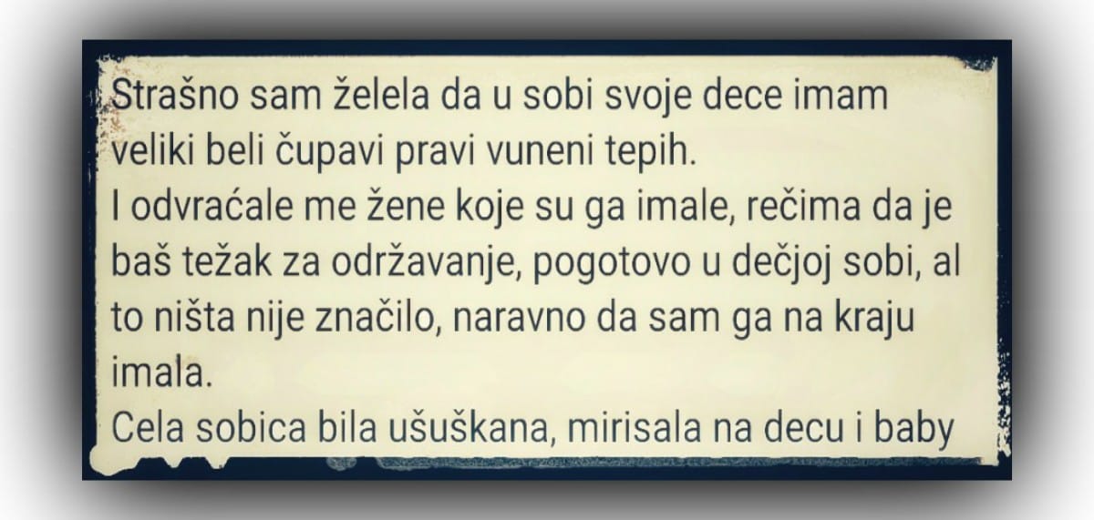 Strašno sam želela da u sobi svoje dece imam veliki beli čupavi pravi vuneni tepih. I odvraćale me žene koje su ga imale, rečima da…