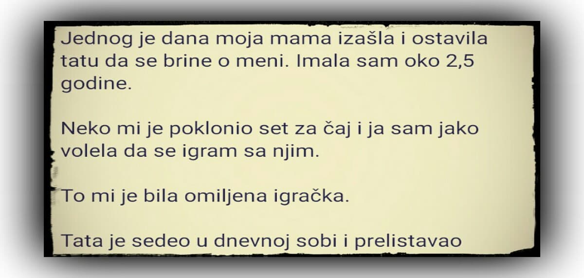Jednog je dana moja mama izašla i ostavila tatu da se brine o meni. Imala sam oko 2,5 godine. Neko mi je poklonio set za…PročitajČaj sa tatom