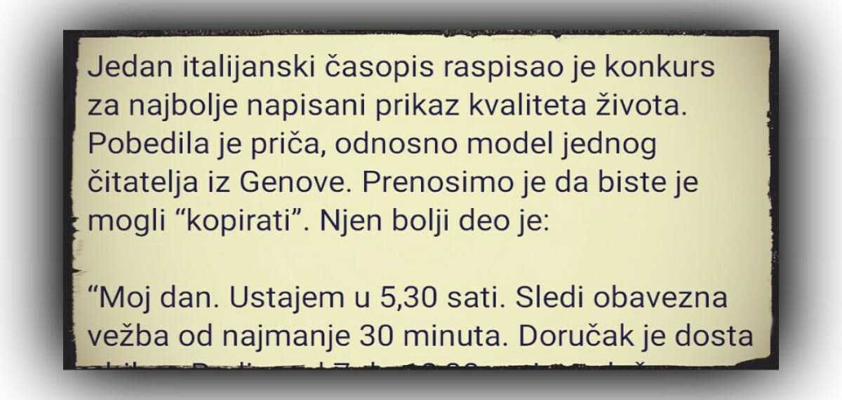 Jedan italijanski časopis raspisao je konkurs za najbolje napisani prikaz kvaliteta života. Pobedila je priča, odnosno model jednog čitatelja iz Genove. Prenosimo je da biste…