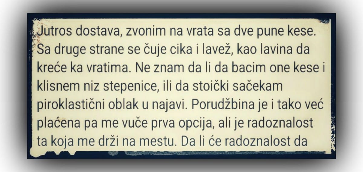 Jutros dostava, zvonim na vrata sa dve pune kese. Sa druge strane se čuje cika i lavež, kao lavina da kreće ka vratima. Ne znam…