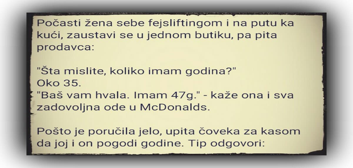 Počasti žena sebe fejsliftingom i na putu ka kući, zaustavi se u jednom butiku, pa pita prodavca: “Šta mislite, koliko imam godina?” Oko 35. “Baš…