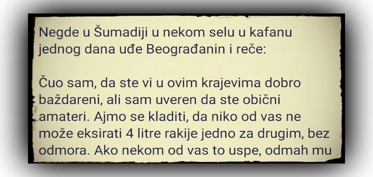 Negde u Šumadiji u nekom selu u kafanu jednog dana uđe Beograđanin i reče: Čuo sam, da ste vi u ovim krajevima dobro baždareni, ali…