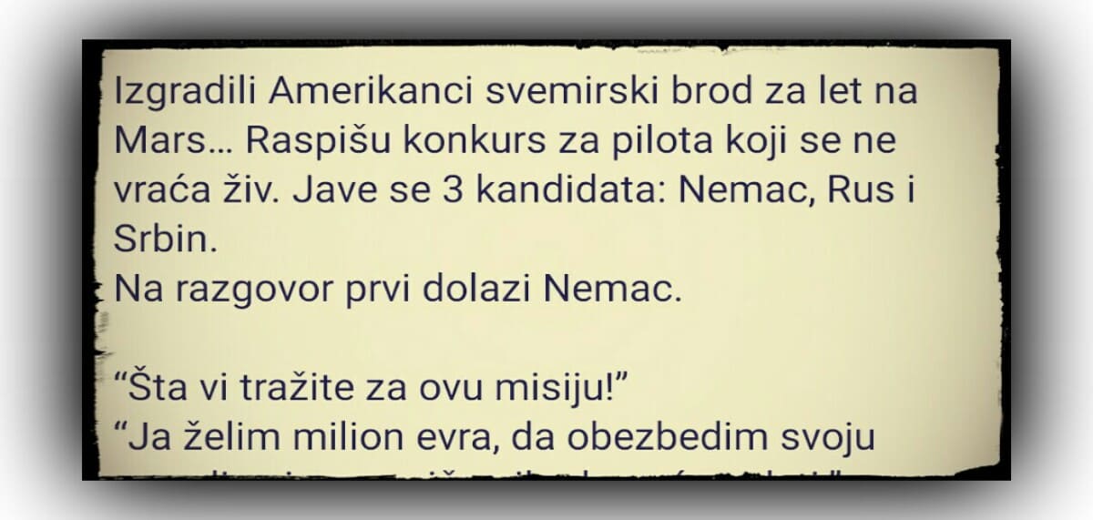 Izgradili Amerikanci svemirski brod za let na Mars… Raspišu konkurs za pilota koji se ne vraća živ. Jave se 3 kandidata: Nemac, Rus i Srbin.…