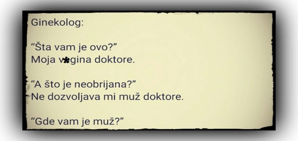 Ginekolog: “Šta vam je ovo?” Moja vagina doktore. “A što je neobrijana?” Ne dozvoljava mi muž doktore. “Gde vam je muž?” U hodniku. Doktor izlazi…