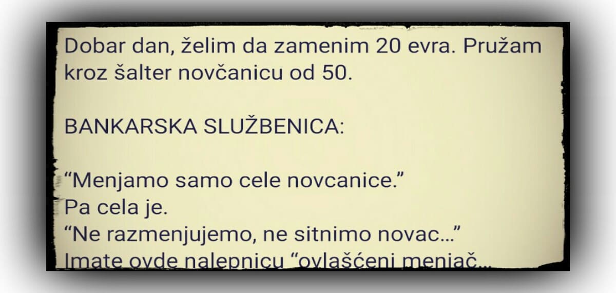 Dobar dan, želim da zamenim 20 evra. Pružam kroz šalter novčanicu od 50. BANKARSKA SLUŽBENICA: “Menjamo samo cele novcanice.” Pa cela je. “Ne razmenjujemo, ne…