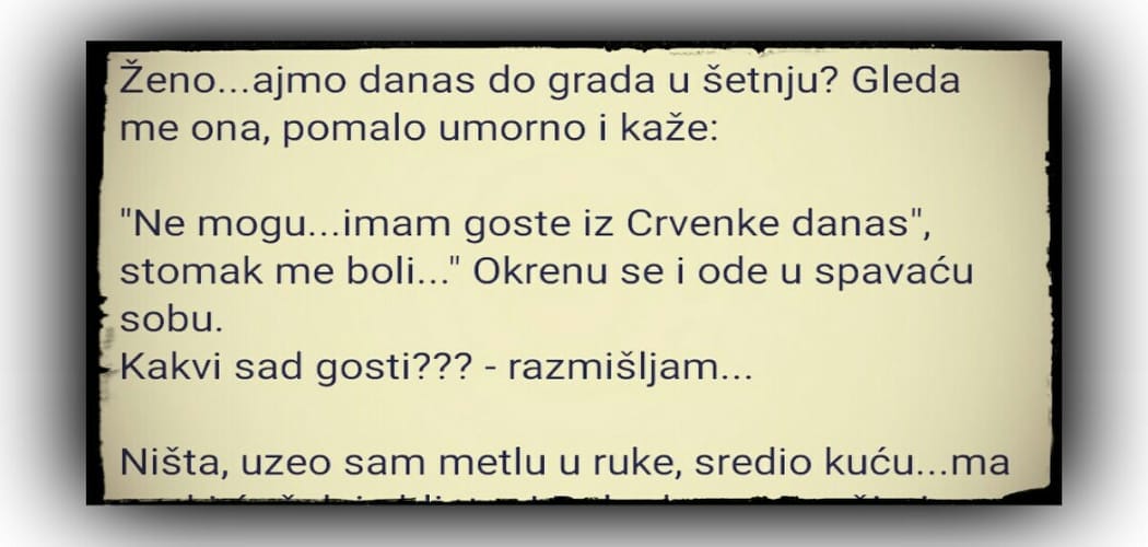 Ženo…ajmo danas do grada u šetnju? Gleda me ona, pomalo umorno i kaže: “Ne mogu…imam goste iz Crvenke danas”, stomak me boli…” Okrenu se i…