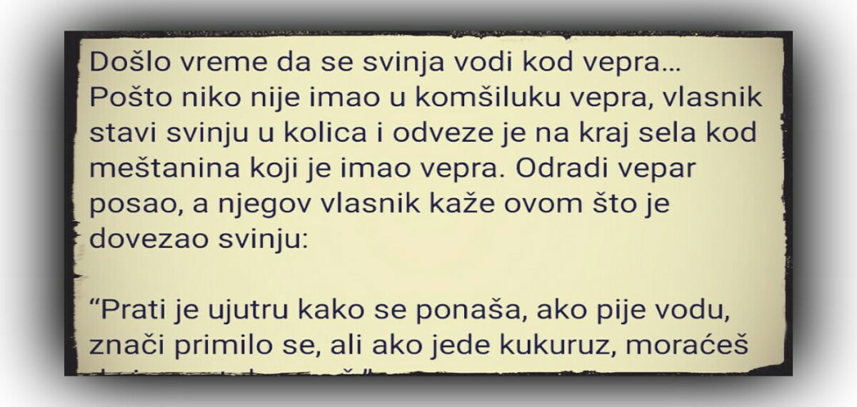 Došlo vreme da se svinja vodi kod vepra… Pošto niko nije imao u komšiluku vepra, vlasnik stavi svinju u kolica i odveze je na kraj…