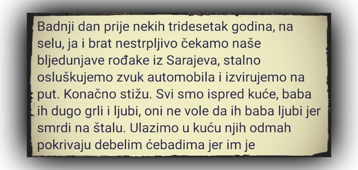 Badnji dan prije nekih tridesetak godina, na selu, ja i brat nestrpljivo čekamo naše bljedunjave rođake iz Sarajeva, stalno osluškujemo zvuk automobila i izvirujemo na…
