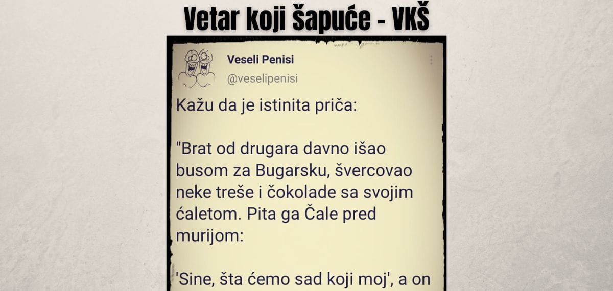 "Brat od drugara davno išao busom za Bugarsku, švercovao neke treše i čokolade sa svojim ćaletom. Pita ga Čale pred murijom: