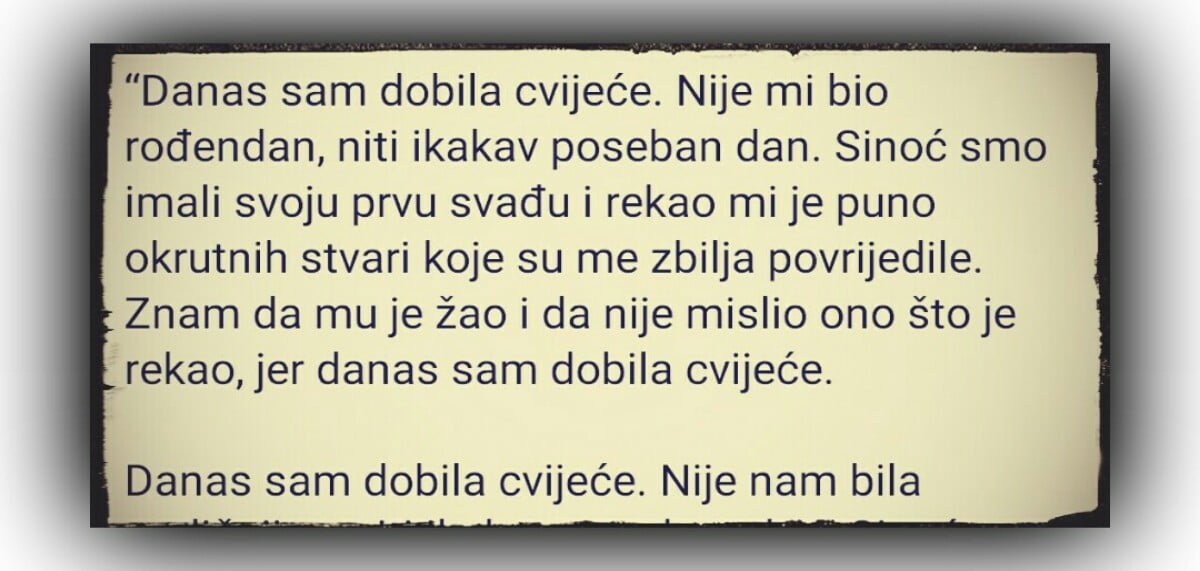 “Danas sam dobila cvijeće. Nije mi bio rođendan, niti ikakav poseban dan. Sinoć smo imali svoju prvu svađu i rekao mi je puno okrutnih stvari koje su me zbilja povrijedile.