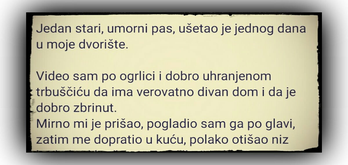 Jedan stari, umorni pas, ušetao je jednog dana u moje dvorište.