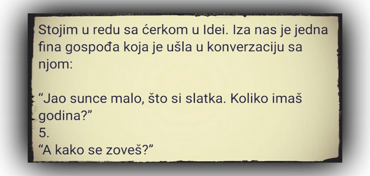 Stojim u redu sa ćerkom u Idei. Iza nas je jedna fina gospođa koja je ušla u konverzaciju sa njom: