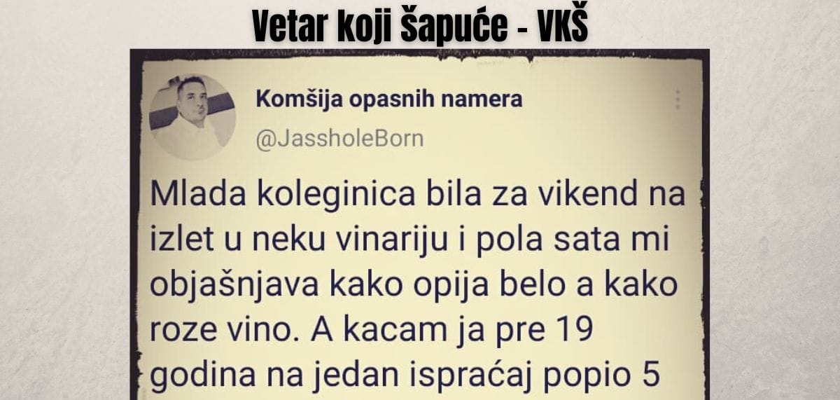 Mlada koleginica bila za vikend na izlet u neku vinariju i pola sata mi objašnjava kako opija belo a kako roze vino. A kacam ja pre 19 godina na jedan ispraćaj popio 5 kila vina i opijen upao u koprive ispred kuće lepe Zlate ona tek bila pošla u obdanište i učila slova iz bukvar.