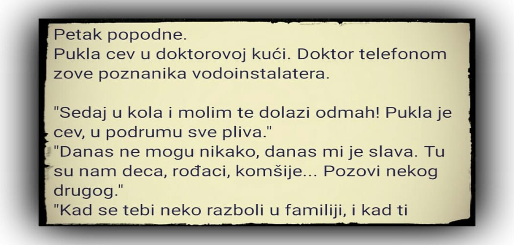 Pukla cev u doktorovoj kući. Doktor telefonom zove poznanika vodoinstalatera.