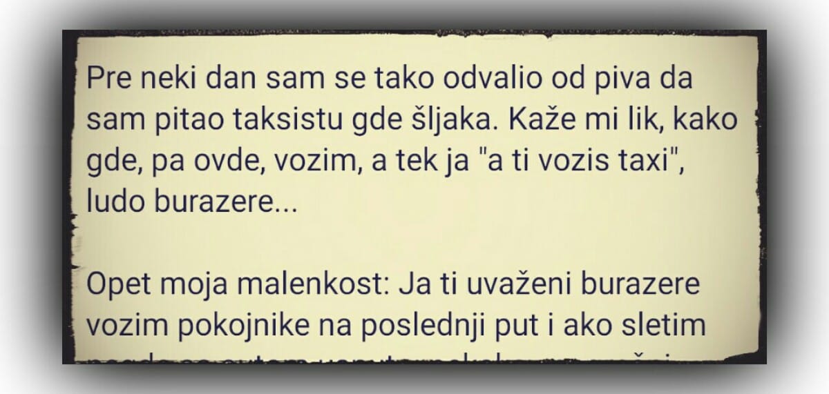 Pre neki dan sam se tako odvalio od piva da sam pitao taksistu gde šljaka. Kaže mi lik, kako gde, pa ovde, vozim, a tek ja “a ti vozis taxi”, ludo burazere…