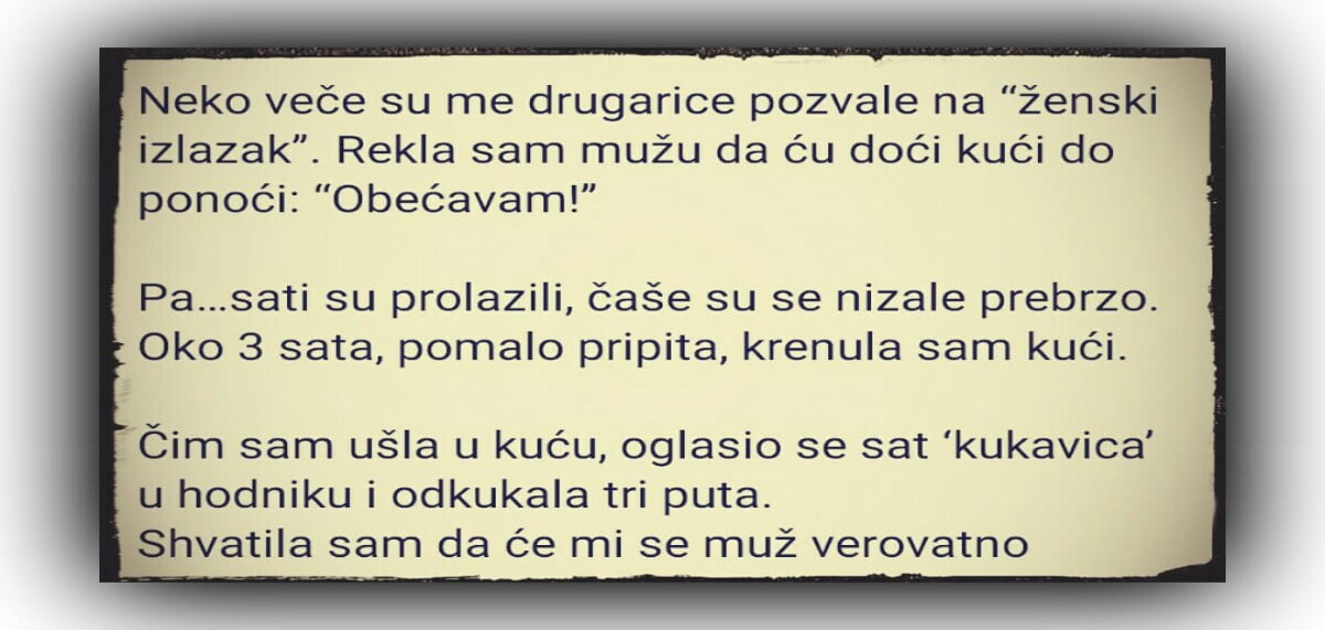 Neko veče su me drugarice pozvale na “ženski izlazak”. Rekla sam mužu da ću doći kući do ponoći: “Obećavam!”