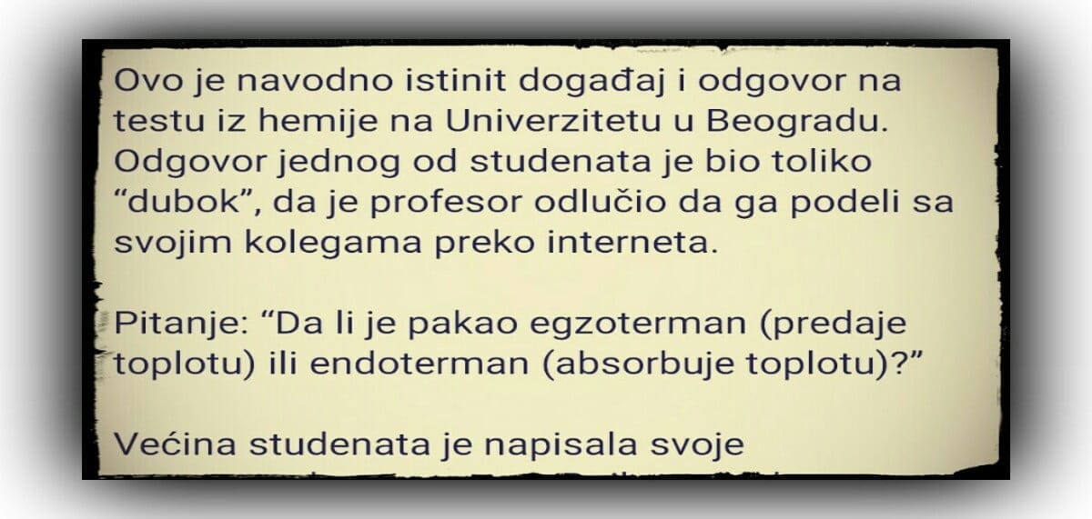 Ovo je navodno istinit događaj i odgovor na testu iz hemije na Univerzitetu u Beogradu. Odgovor jednog od studenata je bio toliko “dubok”, da je profesor odlučio da ga podeli sa svojim kolegama preko interneta.