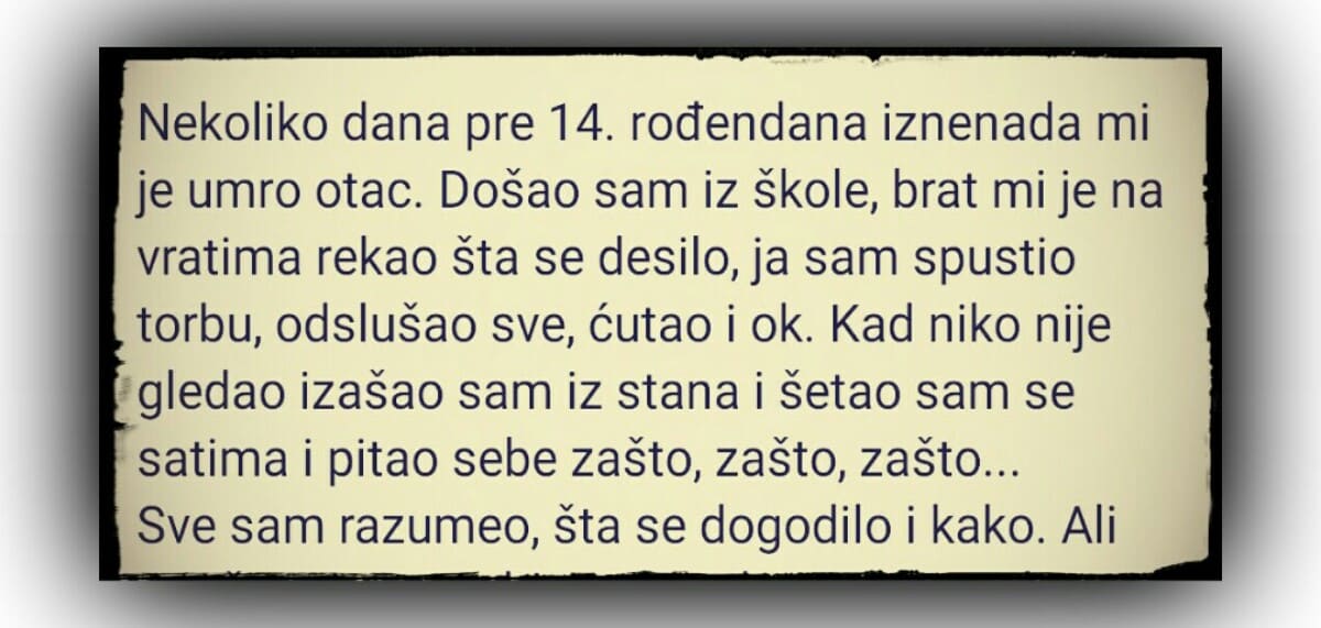 Nekoliko dana pre 14. rođendana iznenada mi je umro otac. Došao sam iz škole, brat mi je na vratima rekao šta se desilo, ja sam spustio torbu, odslušao sve, ćutao i ok. Kad niko nije gledao izašao sam iz stana i šetao sam se satima i pitao sebe zašto, zašto, zašto…
