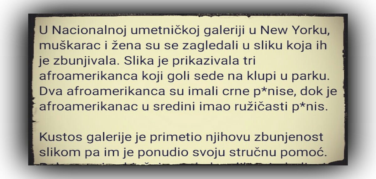 U Nacionalnoj umetničkoj galeriji u New Yorku, muškarac i žena su se zagledali u sliku koja ih je zbunjivala. Slika je prikazivala tri afroamerikanca koji goli sede na klupi u parku. Dva afroamerikanca su imali crne p*nise, dok je afroamerikanac u sredini imao ružičasti p*nis.