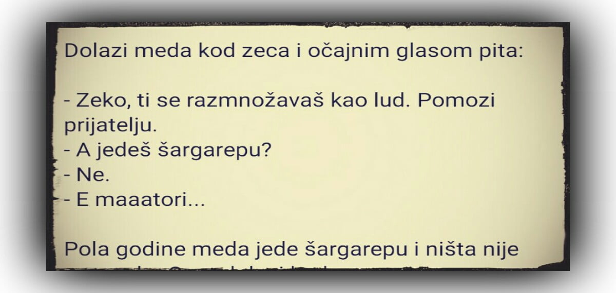 Meda jede sledeće pola godine šargarepu rezanu na kockice sa graškom i ništa. Dolazi kod zeca opet: